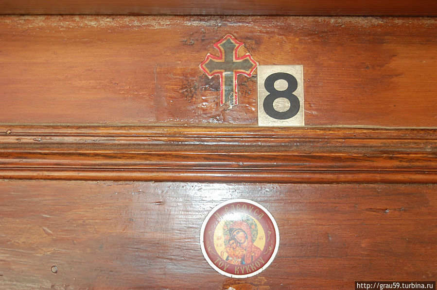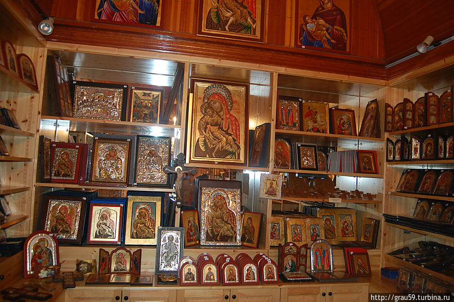 Очередь оказалась небольшой и мы потихоньку прошлись вдоль алтаря, огороженного от храма железной оградой. В центре находилась икона Богородицы Елеусы, справа от иконы находится имитация чёрной руки, напоминающая о чуде, сотворенном с арабом. Араб попытался сорвать серебряную ризу с иконы и у него отсохла рука.