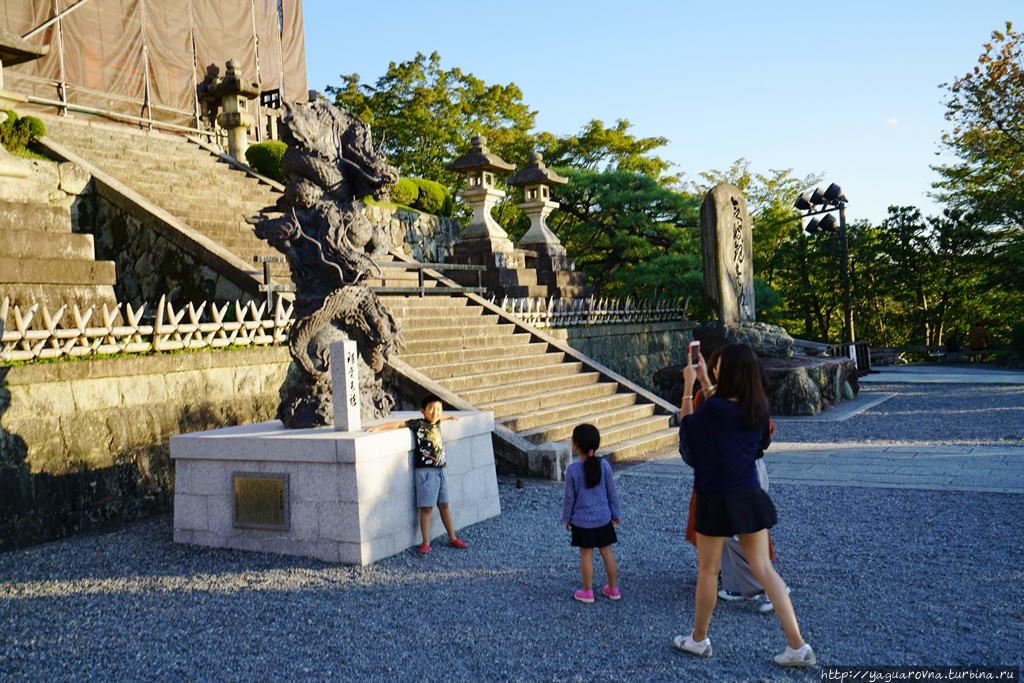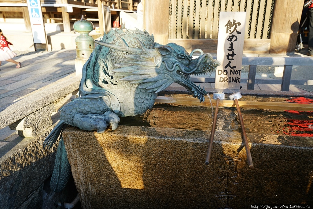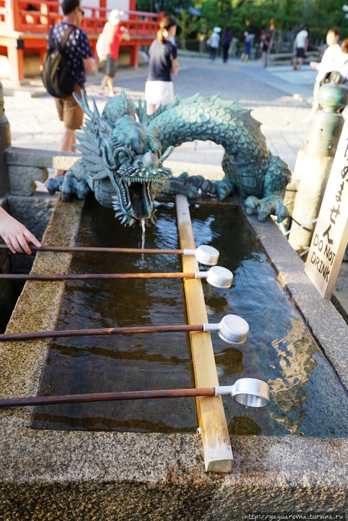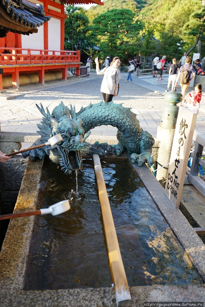 Перед входом в храм японцы производят омовения, для чего здесь сделаны ванночки с ковшиками, и ванночки украшены драконами — одно из воплощений богини. ..