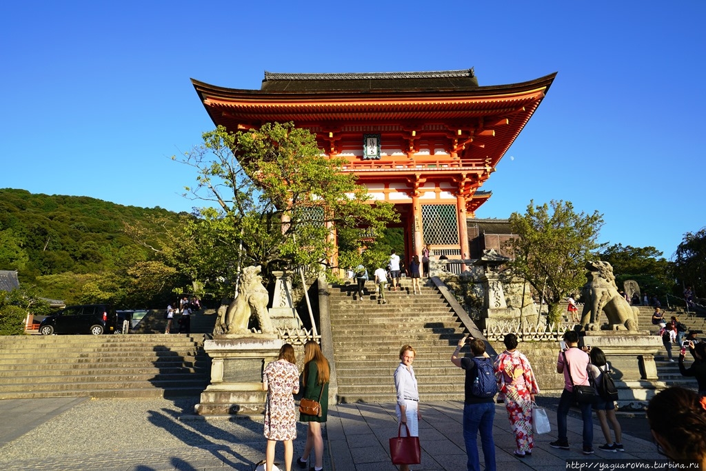 От вокзала Киото на автобусах маршрутов 100 или 206, 15 минут, 230 иен, остановка Gojo-zaka или Kiyomizu-michi. Дорога до храма от этих остановок идет в гору и занимает примерно 10 минут.