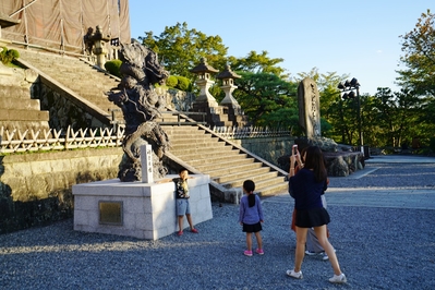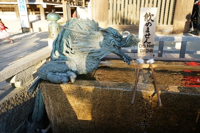 Перед входом в храм японцы производят омовения, для чего здесь сделаны ванночки с ковшиками, и ванночки украшены драконами — одно из воплощений богини. ..