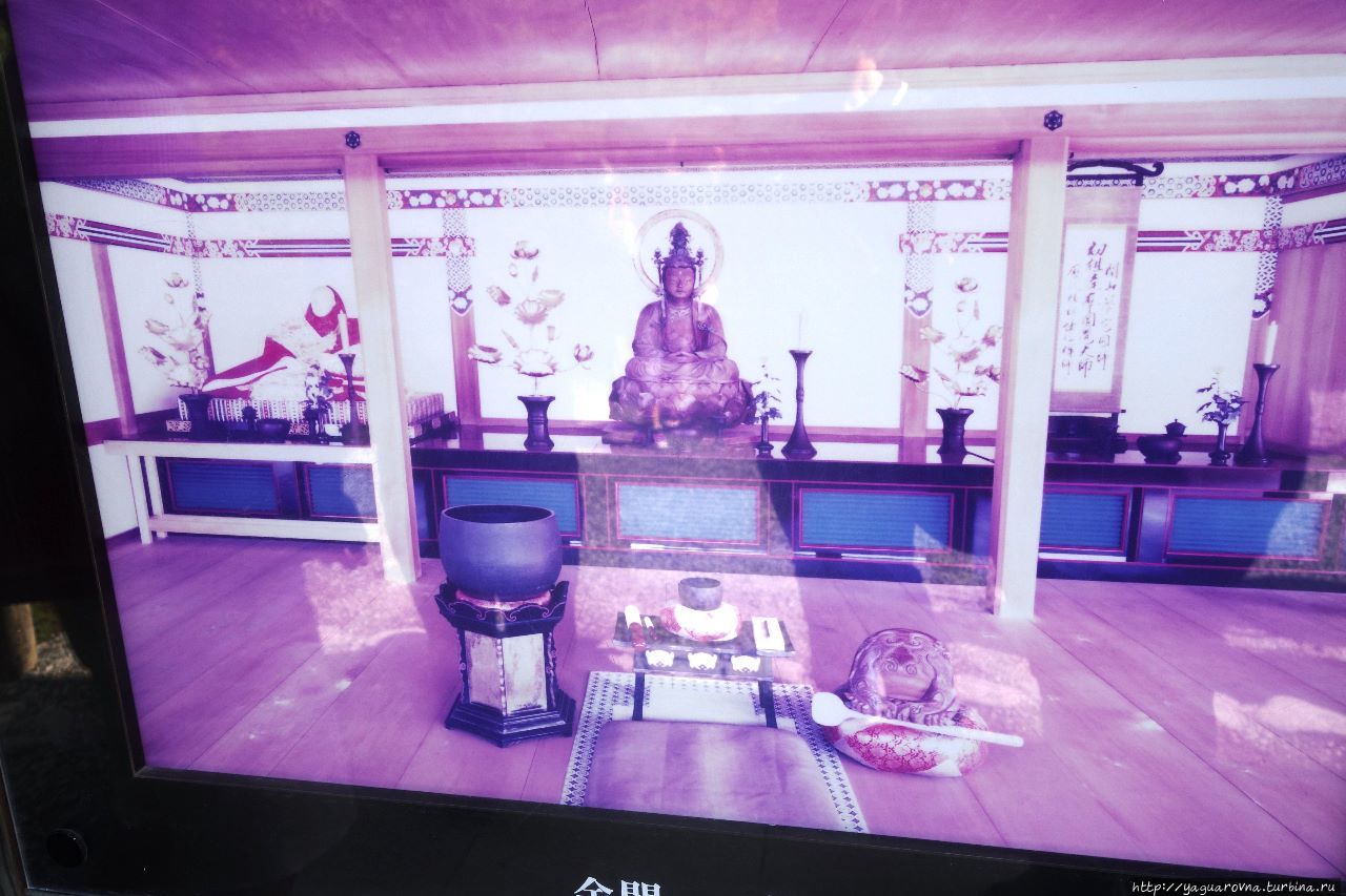 Золотой Павильон формально является сяриден – местом для хранения реликвий. На одном из стендов я сфотографировала изображение одного из помещений изнутри. Расположение в саду на краю озера типично для стиля Синден периода Хейан и предназначено, чтобы ощущать гармонию между небесами и землей. Павильон находится частично на водоеме и отражается в его водах, сегодня поразительно гладких. На поверхности видны 10 маленьких островов. Философия дзэн прослеживается через камни, мосты, которые расположены в особенном стиле и представляют известные места китайской и японской литературы. Четыре камня, формирующие горизонтальную линию, называют “Камень Ёдомари», которые представляют парусные шлюпки, закрепленные на ночь. Эти лодки направляются на Остров Вечной Жизни из китайской мифологии.