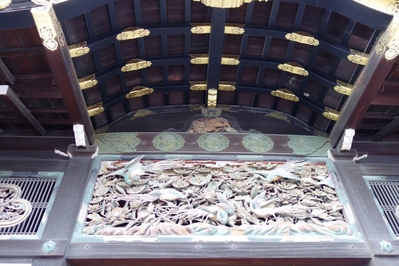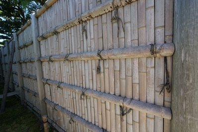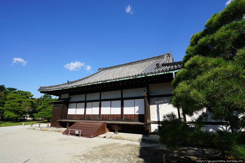 Это целый комплекс классических деревянных зданий, среди которых особо выделяется дворец Ниномару с "поющими" полами, которые еще называют "соловьиными". По-моему, это сигнализация того времени, если вдруг живая охрана отвлечется, то звук, издаваемый половицами (доски окантованы металлическими полосками, вот они при трении друг о друга под тяжестью шагов и "свистят"), разбудит нерадивых служивых, обязанных сохранить жизнь и здоровье сёгуна. На японском языке это называется Угуису-бари Помимо полов с секретом, во дворце в некоторых комнатах еще были сделаны двери с потайными нишами, где прятались особо доверенные телохранители сёгуна.