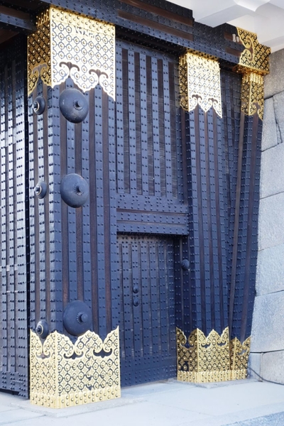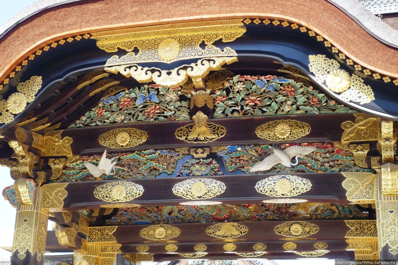 Эти арочные ворота — главный вход на территорию Ниномару, но первоначально ворота принадлежали замку Фусими, у которого своя славная и героическая история, но сейчас не про нее. В 1623 году сёгун Токугава Иэмицу издал закон, лавный смысл которого "одна провинция – один замок", в результате чего замок Фусими был разобран и его части были использованы для нескольких замков и храмов по всей Японии. Так в 1626 году ворота оказались здесь, в замке Нинна-дзи.