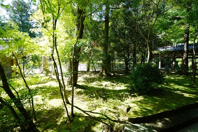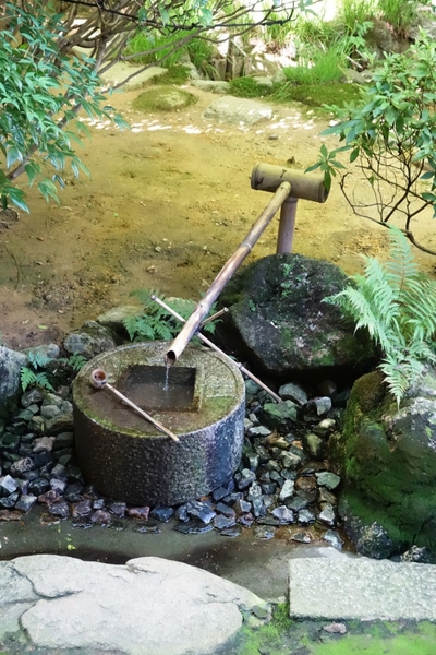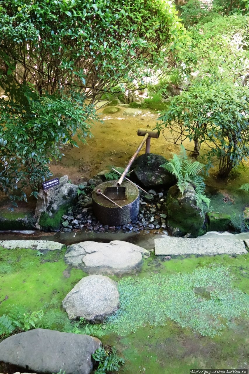 С северной части веранды, где находится дом настоятеля Рёан-дзи, открывается вид на еще один пейзажный сад. Нам сказали, что это сад мха. Честно говоря, мне он больше по душе пришелся, именно здесь захотелось посидеть и поразмышлять. . Здесь находится каменный сосуд Рёан-дзи с водой для омовения рук с деревянными ковшиками с длинной тонкой ручкой. Вокруг отверстия сосуда высечены иероглифы, что в переводе значит "каждый уже имеет, то в чём он нуждается". Этот сосуд пожертвовал храму Рёан-дзи Токугава Мицукуни.