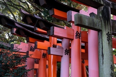 Вернувшись домой, я пересмотрела «Мемуары гейши», чтобы увидеть тот самый момент, когда героиня бежала по тоннелю из оранжевых ворот. Помните его? Снимали здесь. Фусими Инари — очень необычное место. Это синтоистский храм, посвященный богине Инари, покровительствующей лисам. Поэтому его другое название — Лисий храм. Почему лиса? Это животное помогало защищать рис, главное богатство Японии, от грызунов. Я не знала этой истории и сначала подумала, что это кошки, но с какими-то вытянутыми мордочками. И только потом узнала, что это были лисы. Статуи лис держат в зубах ключи от рисохранилищ или колоски риса. На территории храма расположены оранжевые ворота — тории, число которых исчисляется десятком тысяч. Тории разного размера — от совсем небольших до огромных. Они были подарены храму в качестве подношения богатыми людьми и корпорациями. На обратной стороне пишется имя дарителя и дата. Чёрные иероглифы на каждом «столбе» и есть эти имена и цифры. Тории больших размеров расположены друг рядом с другом и образуют туннели, петляющие по территории. Это место, конечно, не перепутаешь ни с каким другим!