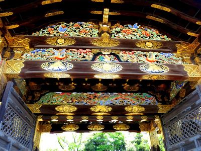 Древние японские постройки не отличаются яркими красками. Наоборот, здесь красота заключается в природном цвете дерева, из которого построены храмы и замки. Исключением является, пожалуй, только белый цвет. Поэтому так ценна золотая отделка их этих ворот.