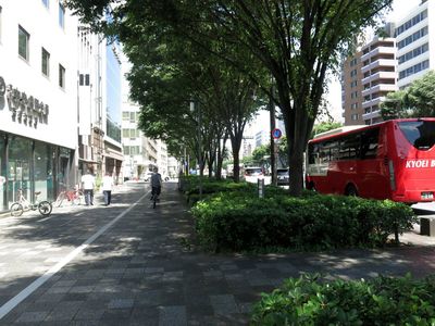 Весь осмотр занял несколько часов, и вернувшись в отель, мы пообедали и снова в путь. Пора посмотреть Киото. Центральные улицы широкие, в виде проспектов, с современными домами и большими тротуарами. От жары здесь помогают высокие деревья. Собственно, глядя на фото, даже трудно определить в какой стране это находится, вполне может сойти за южноамериканский город или даже европейский.