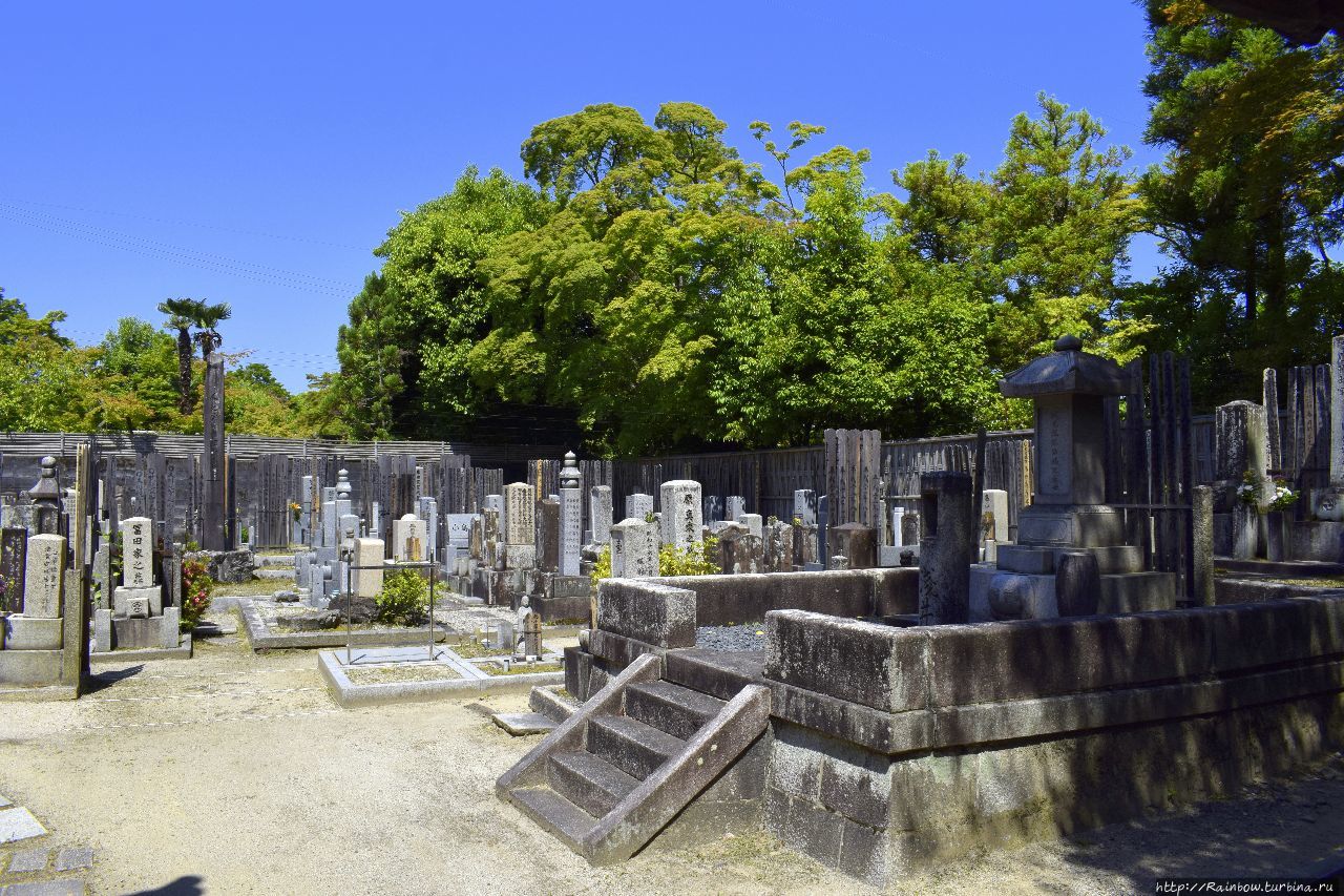 Рядом с храмом, как это часто бывает во всех странах, расположено кладбище. Туда туристам вход закрыт, но оно небольшое, его и так видно почти целиком со входа. В принципе, кладбище, как кладбище, могилы, памятники. Только по-японски, немного сжато в пространстве.