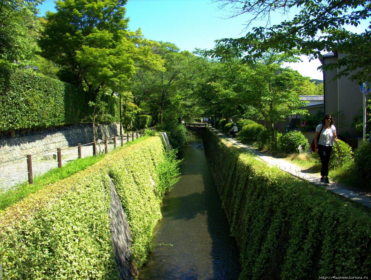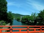 На автобусе проезжаем полгорода. Несколько раз по мосту переезжаем реку. И река, и берега выглядят очень симпатично. В Киото вообще не бывает холодов, а сейчас, во второй половине мая, все вокруг зеленое и солнце светит ярко, днем даже жарковато.