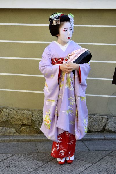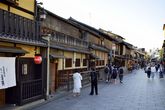 История гейш в Японии очень древняя и интересная. Это — удивительная профессия, включающая в себя умение развлекать клиентов японским танцем, пением, ведением чайной церемонии, беседой на любую тему, одетые в традиционные кимоно, носящие специальный макияж и прическу. Сегодня их осталось очень мало, и встретить их здесь — большая удача. Скорее можно встретить туристов и японок, переодетых в кимоно, часто взятое напрокат. Гейши еще называются "гэйко", а их ученицы "майко". Но иногда, если повезет, то можно встретить гейшу, идущую вечером на работу в один из чайных домиков.