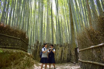 Здесь уже сотни лет растет бамбук — вечнозеленое дерево со светлым, тонким и высоким стволом, благодаря которому в бамбуковом лесу так светло, что к нему прижилось название роща. Отдаленно он напоминает березовую рощу. Рощу основали монахи, а теперь она является национальным достоянием и охраняется государством.