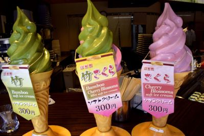 Когда мы вернулись в город, что бы попасть на вокзал, нас ждал заключительный аккорд. Это оказался магазинчик оригинального мороженного. Не просто так, а мороженное из листьев бамбука или лепестков сакуры. Где еще такое встретишь, как не в бамбуковой роще? Мороженное оказалось очень вкусным.