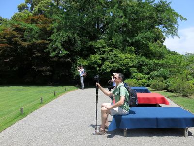 Но я к этому времени ужасно устала и моя спина за несколько дней бесконечного хождения давала себя знать. Лавочек нет, отдохнуть на траве нельзя. И поэтому, мысленно извинившись перед всеми японцами, я принимаю такое горизонтальное положение.
