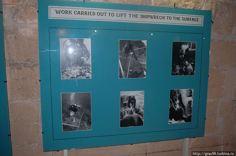 Фотографии, находящиеся в музее, показывают как выглядело судно под водой и как его обследовали. Схема на стене показывает в разрезе, что и где находилось на этом судне, карты и рисунки отражают морские пути Средиземноморья того времени и жизнь портов. Экспонаты являются частью груза, находившегося на корабле.