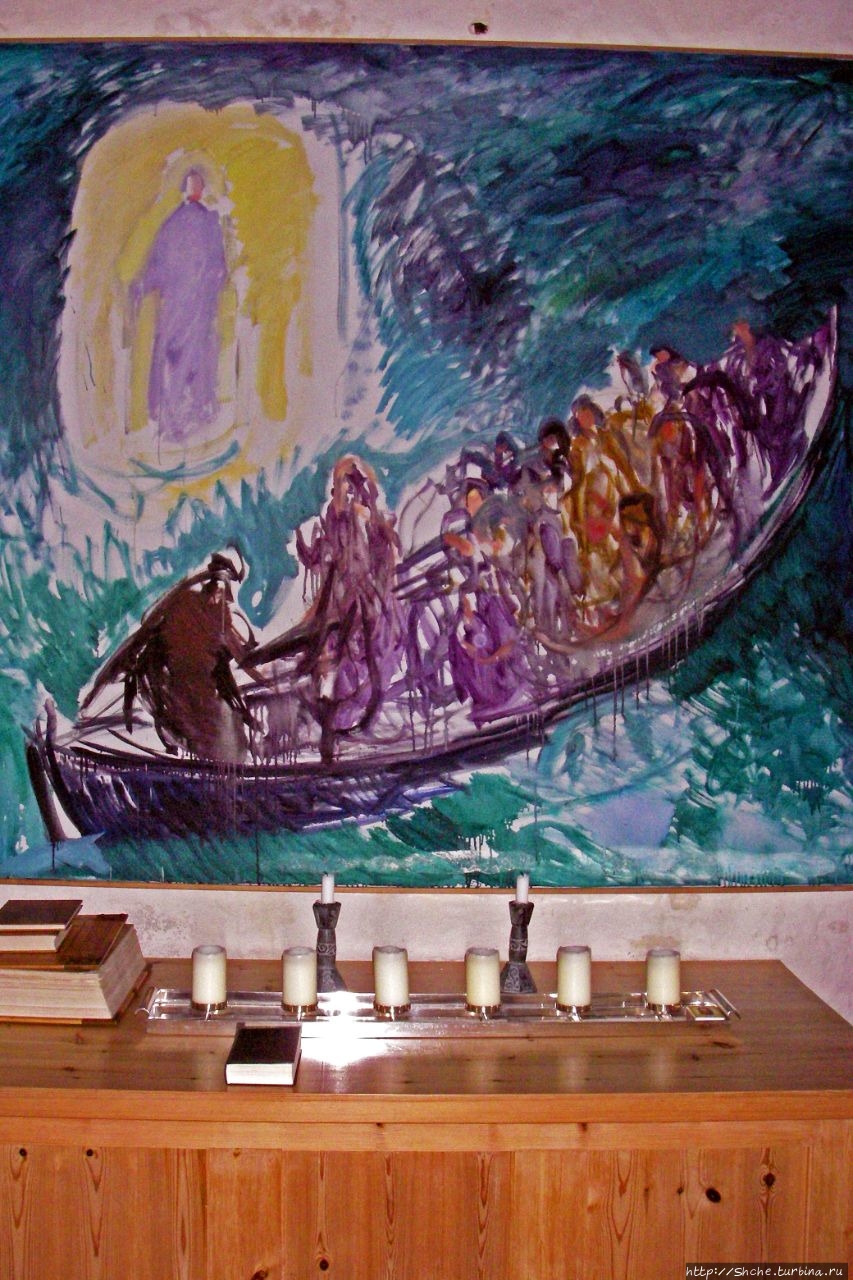 Единственная картина, служащая видимо подобием иконы, рассказывает популярную в северных землях легенду, как лодка рыбаков терпела крушение, и ту явился образ Христа, они взмолились ему и были спасены.