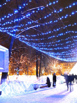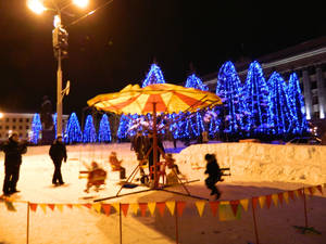 Если у монастыря и на набережной безлюдно, то на Театральной площади кипит жизнь: детишки катаются с ледяных горок и на каруселях; взрослые прогуливаются по площади, оценивающе поглядывая на елку (опять новая в этом году, несмотря на то, что в прошлом была куплена искусственная) – но хороша! Молодежь толпится у фонтана (который закрыт на зиму и украшен изображениями Кутузова – в честь 200-летия победы в Отечественной войне 1812 года). Фонтан, кстати сказать, - ориентир, у которого обычно договариваются встретиться молодые люди.