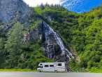 "Свадебная вуаль" - Bridal Veil Falls в каньоне Keystone, мы на своем "доме на колесах" не проехали и километра, как вновь сделали остановку, и поводом стал еще один "именной" водопад... Да, по моему это впервые наш трейлер попал в кадр. Именно на нем мы совершили двухнедельный трип по Аляске. А подом для остановки стал водопад Horsetail Falls.
