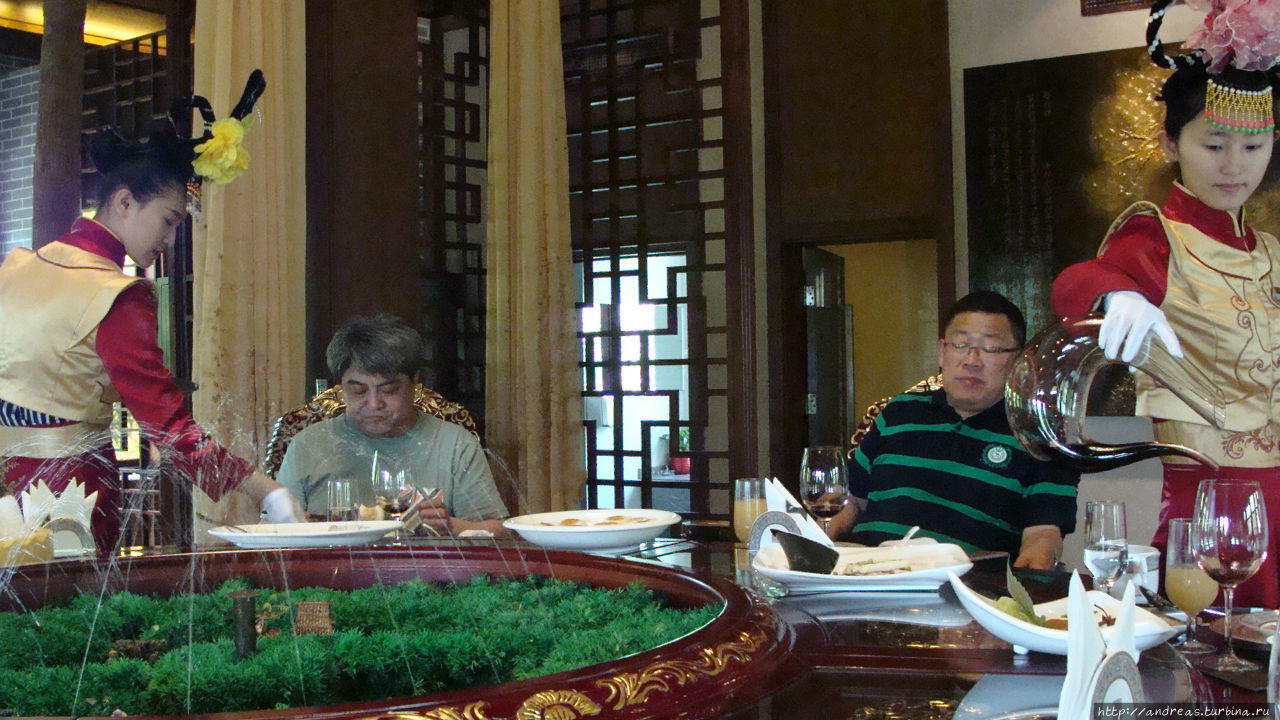 На обед нас пригласили в шикарный ресторан на территории санатория с горячими источниками. Обстановка была экзотичной и романтичной, посередине круглого вращающегося стола находится фонтан, стулья украшены драконами, а официантки в национальной одежде. Бывает, что здесь обедают высокопоставленные чиновники. Руководитель «Золотого Камня» говорил тосты и подходил к каждому, чтобы с ним выпить вина.