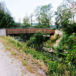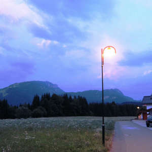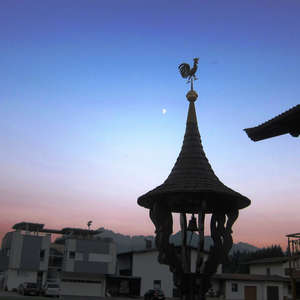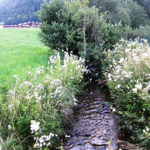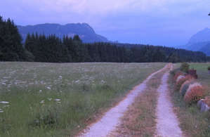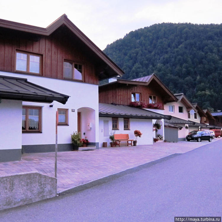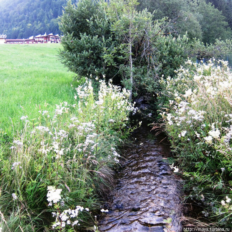 Насмотревшись вдоволь на эту пастораль, на следующий день мы прошлись по окрестностям. Дошли до речки. Прошлись вдоль речки до моста. А оказалось, что в этой точке сливаются два ручья, а между двумя рукавами лесок и тропинка. Само собой, мы пошли в лесок и шли до следующего мостика под веселое журчание с двух сторон. Дорожка расчищенная, никакого мусора и тишина, как будто нет никакого жилья за много километров вокруг. Перейдя мостик, по скошенному лугу дошли до поселка. Это где-то недалеко от центра. Тут есть ресторанчики и кафе, магазины, церковь и супермаркет. Все уже закрыто: все работает до семи, а восемь – это уже очень поздно. Дошли до автомобильного моста. И как раз вовремя: успели поймать облака, окрашенный закатно — золотыми лучами солнца. Эта часть поселка более старая, тем не менее, балкончики с цветами наблюдаются и здесь. Теперь надо решать, по какой дороге возвращаться дамой: кроме той, по которой пришли было еще две. Решили идти вдоль левого ручья, так как по правому берегу мы шли вчера. До околицы мы шли по тротуару, а потом тротуар куда-то исчез, вместо него появилась тропка. Как оказалось, с обеих сторон трассы вместо тротуаров, для пешеходов есть тропинки в лесу. Тропинки связывают между собой отдаленные части поселка. По такой тропке мы дошли до самой гостиницы. Само собой, навестив по дороге лесную часовню, посидев у озерца до полного посинения гор. И домой вернулись в полной темноте.