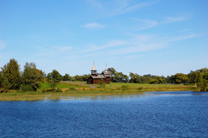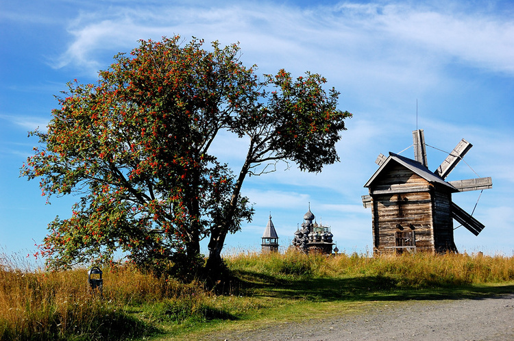 Несколько слов о том, как расположены экспонаты музея. Большая их часть находится на небольшой площади, в той части острова, что к югу от пристани. Тех трех часов, которые отводятся на экскурсию, вполне хватает на неспешный осмотр. Но вот деревни Ямка, Васильево и все прочие строения, что от пристани к северу, в обычную экскурсию не входят. Как до них добираться — не совсем понятно. На дороге мной был замечен какой-то автобус, но пока я раздумывал, он уехал. Возможно, он как раз и был предназначен для передвижения по острову. Пешком же здесь ходить довольно утомительно. Но у меня до отправления теплохода еще оставался почти час и я все же сходил на ту часть острова, которая в официальный маршрут не входит. Дошел до ветряной мельницы, что стоит там на пригорке, заодно посмотрел на деревню Ямка и на часовню Спаса Нерукотворного, что возвышалась вдалеке. А вот до деревни Васильево уже не пошел, боялся опоздать. Вот интересно, а проката велосипедов здесь нет?