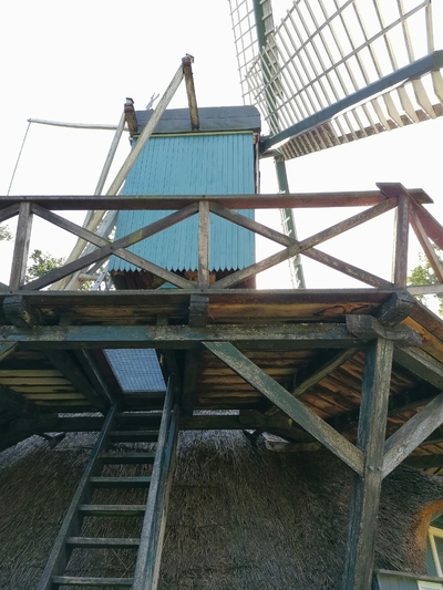 "Голландская" мельница-шляпник 1764 года. У голландок вращается только верхушка или шляпла, механика здесь более сложная, но усилий на вращение требуется гораздо меньше. Мельница многофункциональна, в Голландии эти мельницы использовались в первую очередь для откачивания воды и создания польдеров, затем уже в сельском хозяйстве.