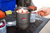 Свободные от ремонта члены команды готовят сосиски на максовой керосинке, обед, так сказать. По моей физиономии видно, что местные сосиски не очень... Да... Это вам не лосятина...