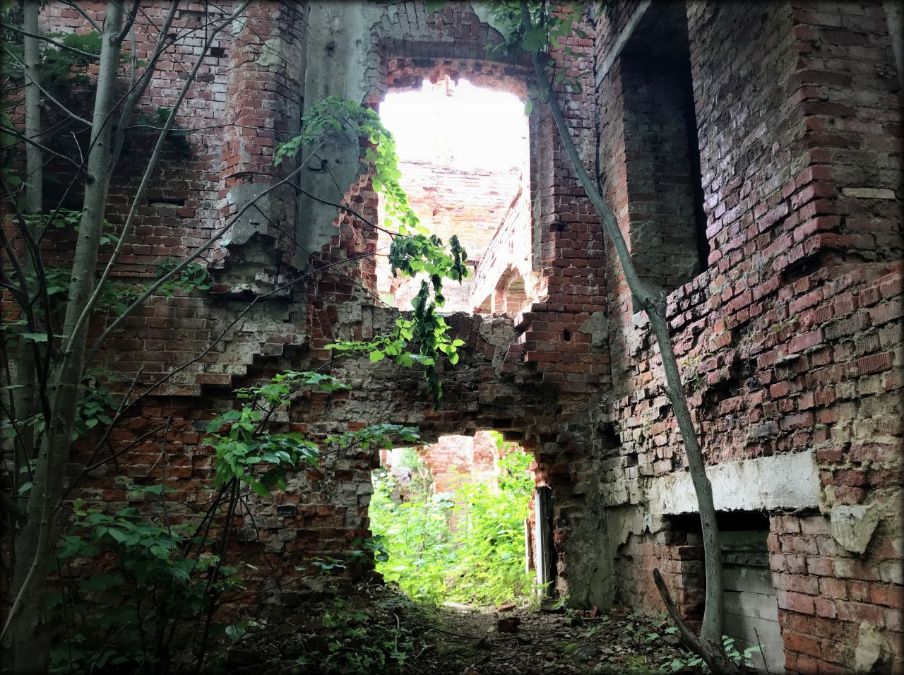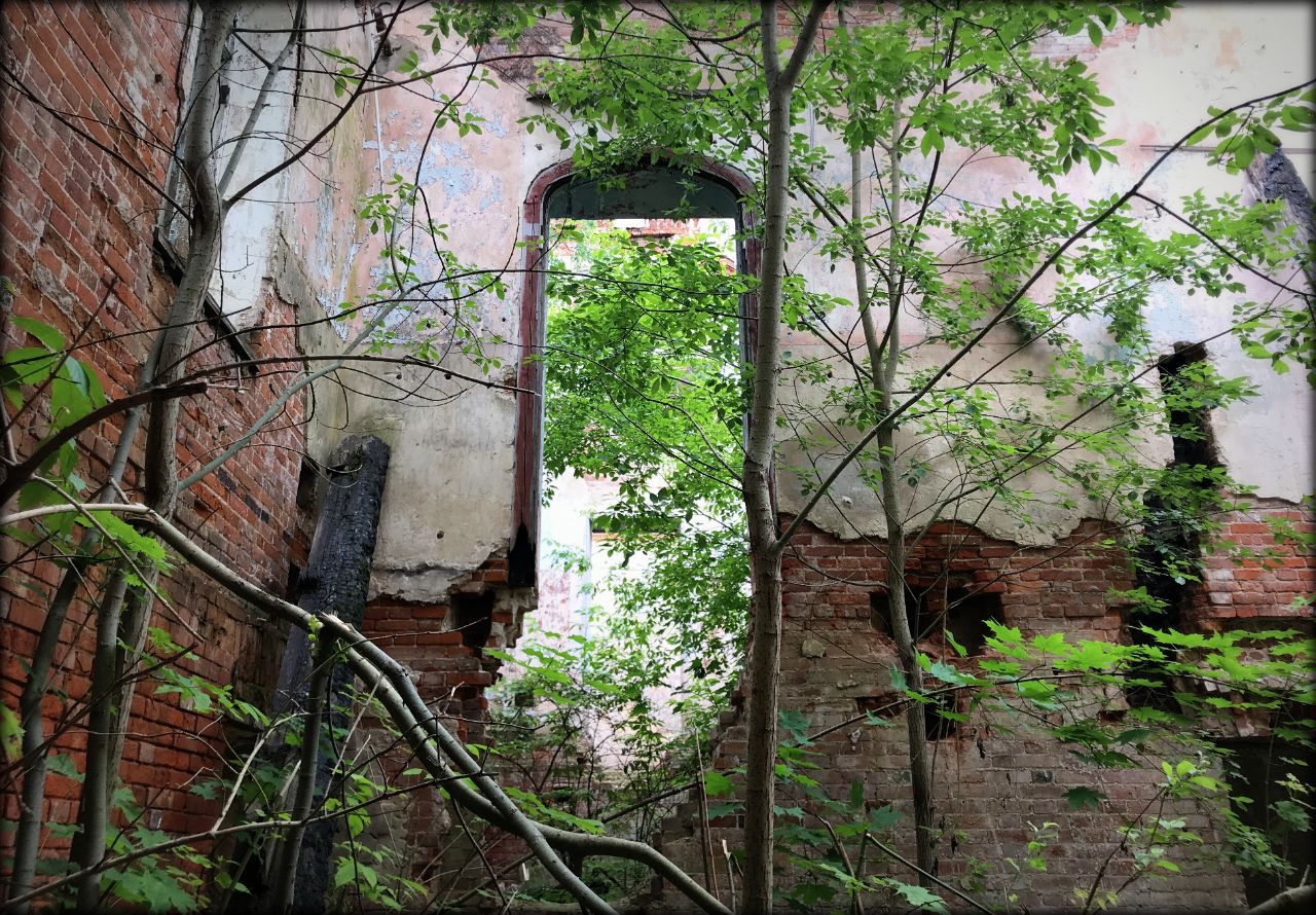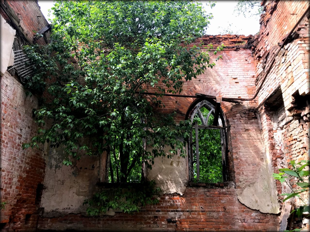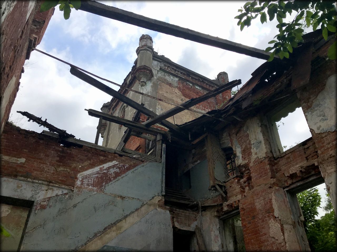 Нужную дверцу в заборе я всё же нашёл и смог полазить по руинам былого величия. Сейчас там всё находится в печальном состоянии — нет потолка, многих стен и даже отсутствует пол. Виной этому не только время, но к сожалению и сами люди.