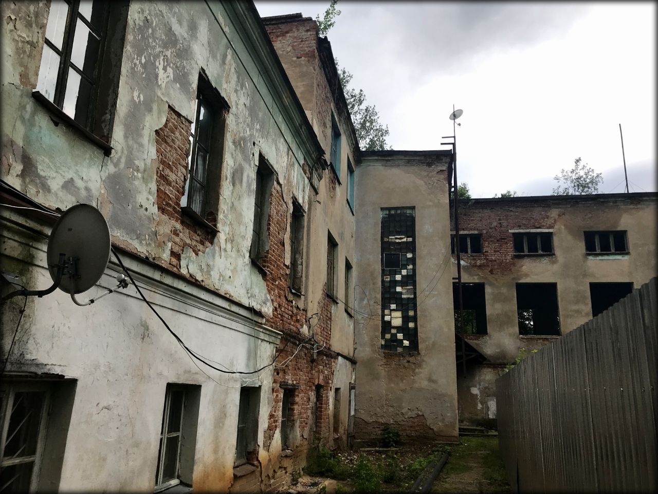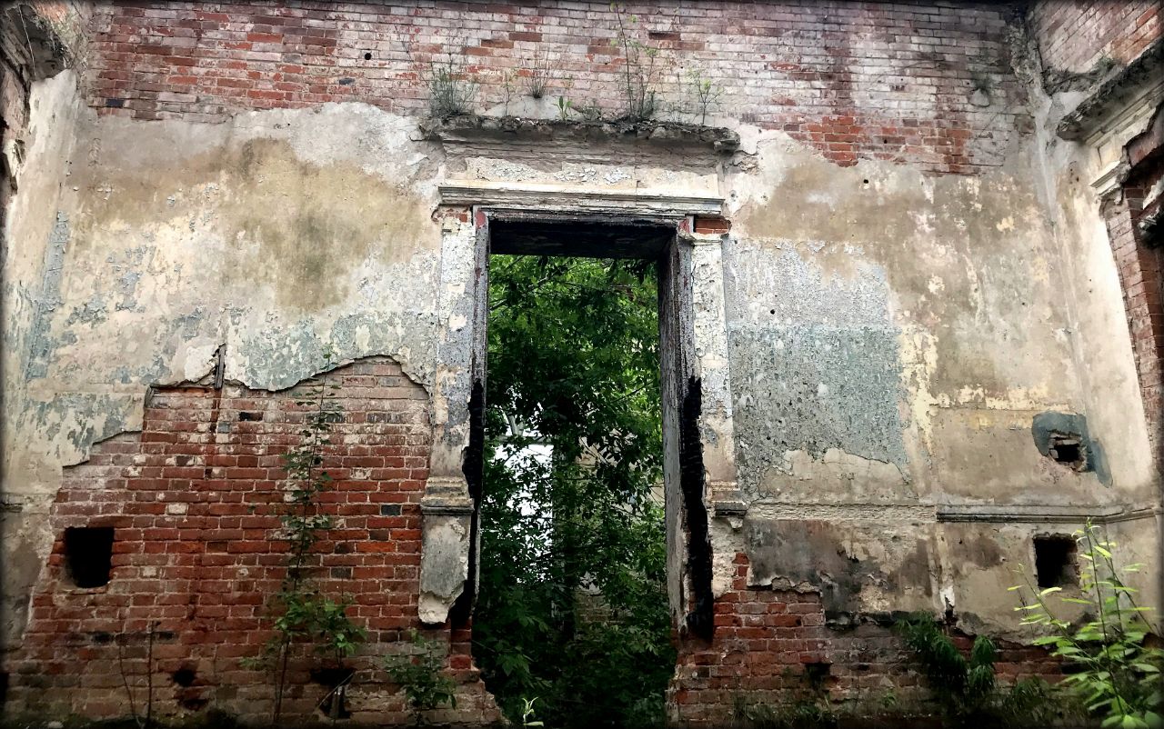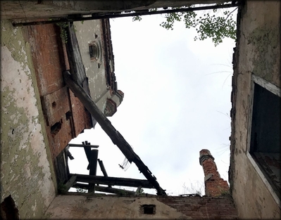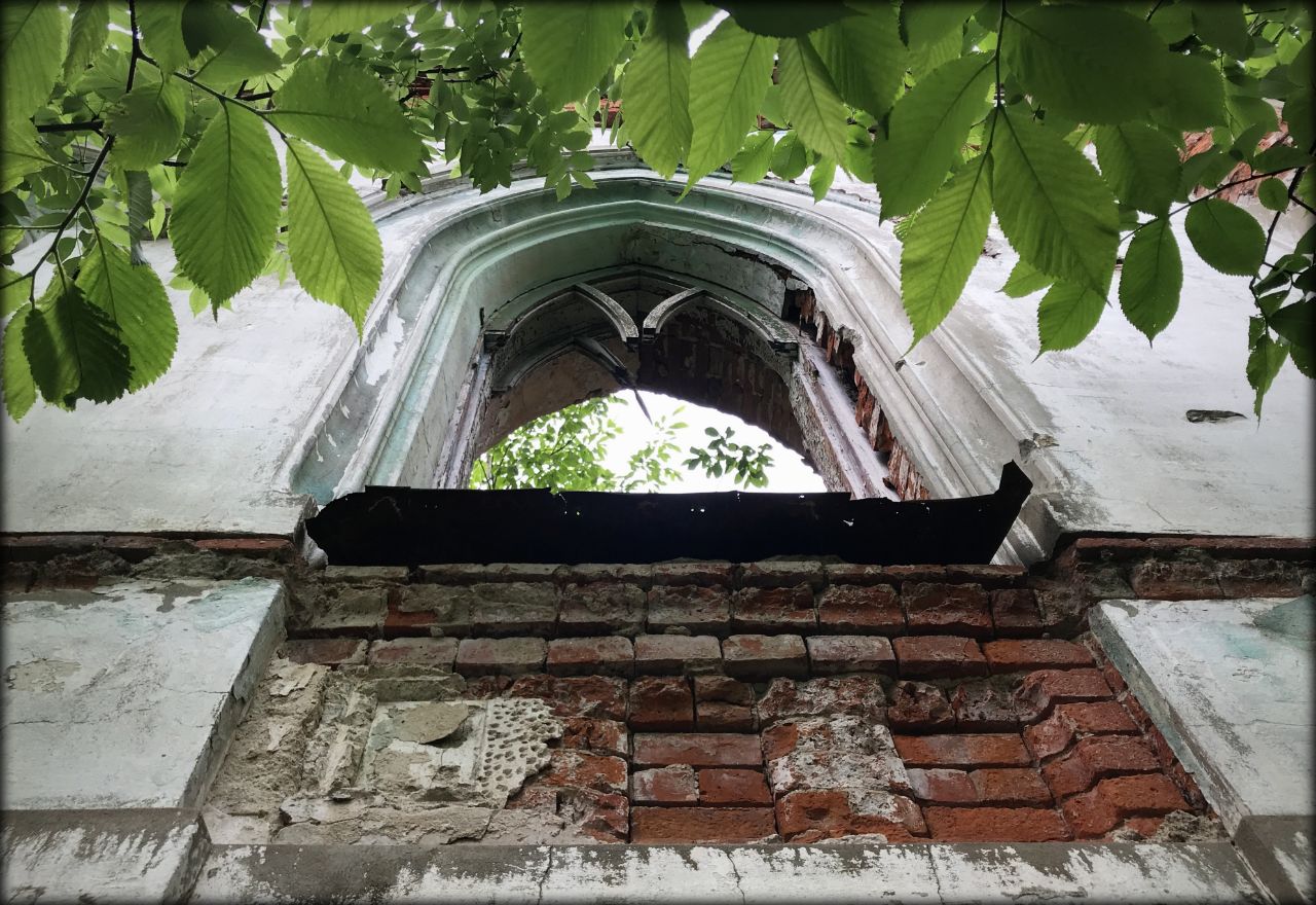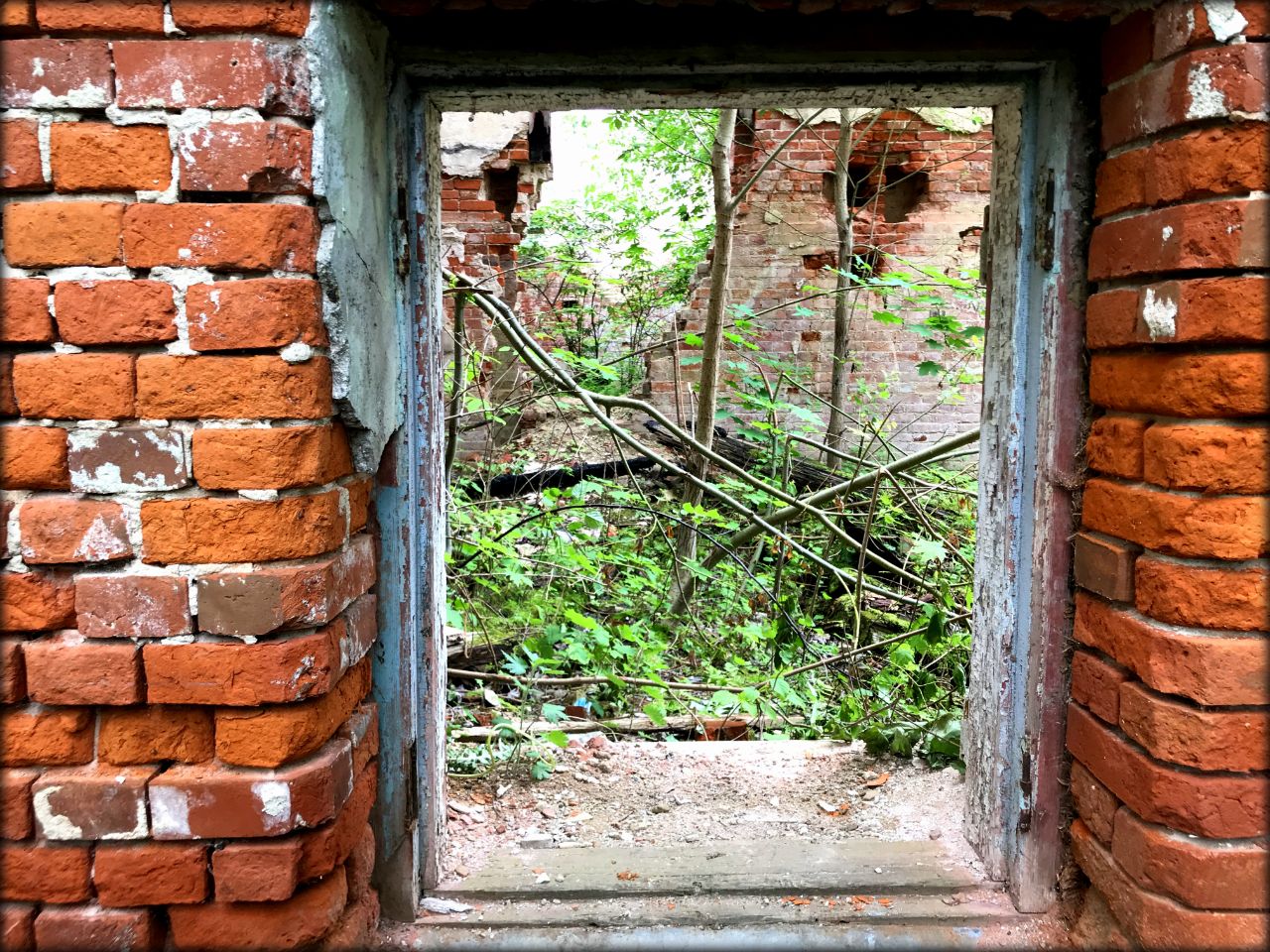 Нужную дверцу в заборе я всё же нашёл и смог полазить по руинам былого величия. Сейчас там всё находится в печальном состоянии — нет потолка, многих стен и даже отсутствует пол. Виной этому не только время, но к сожалению и сами люди.