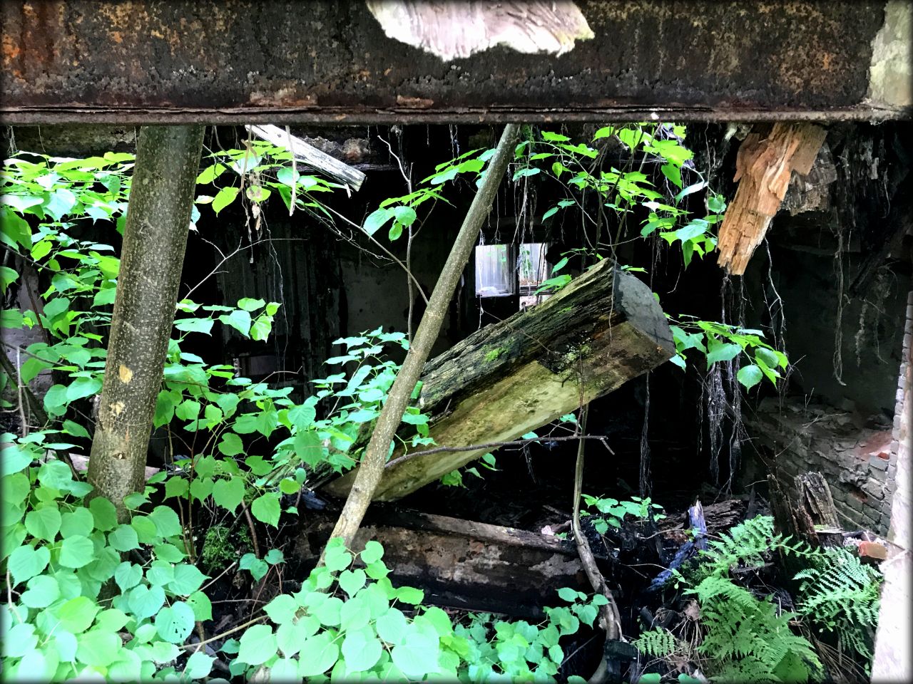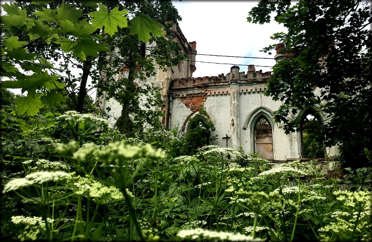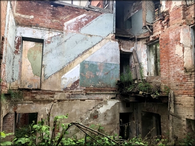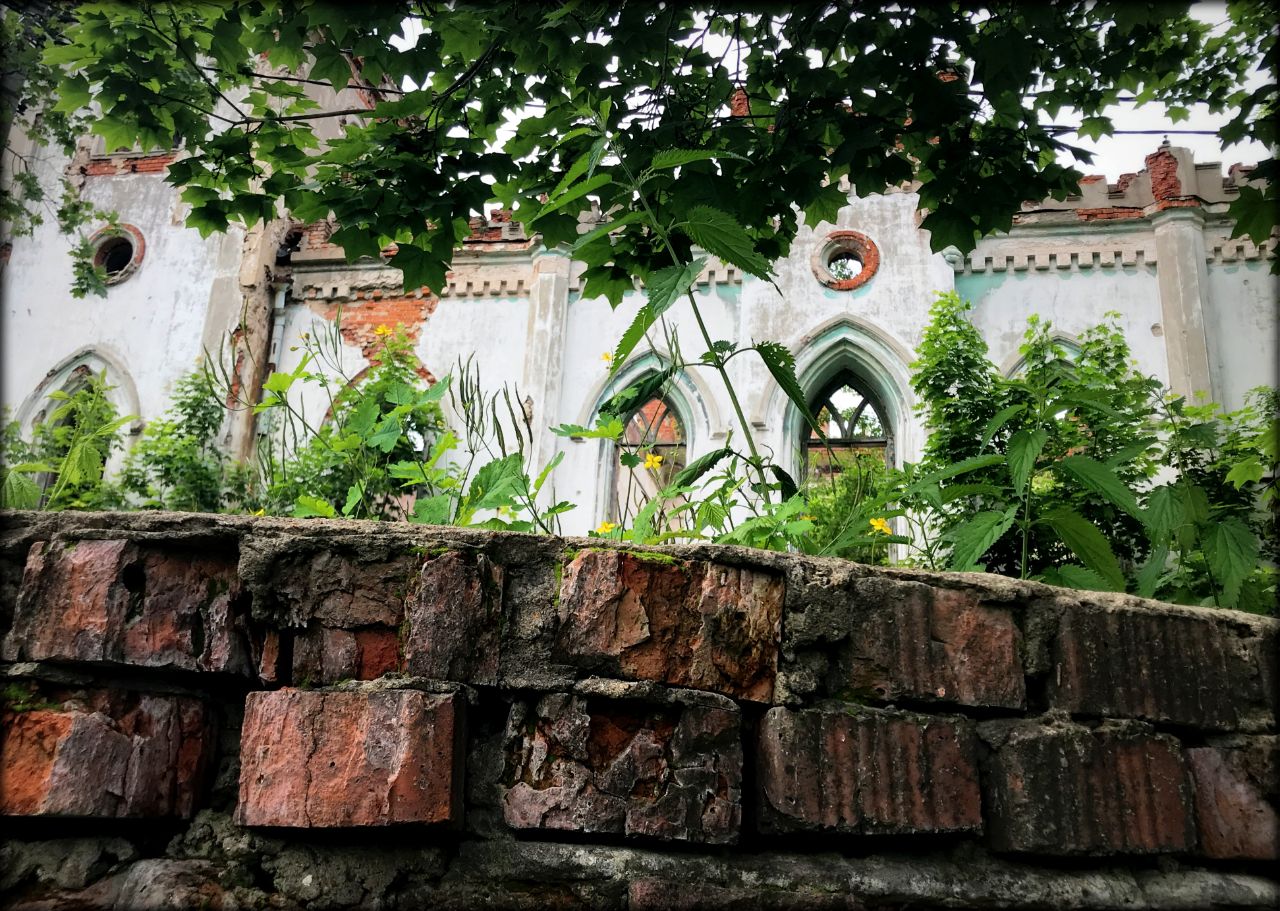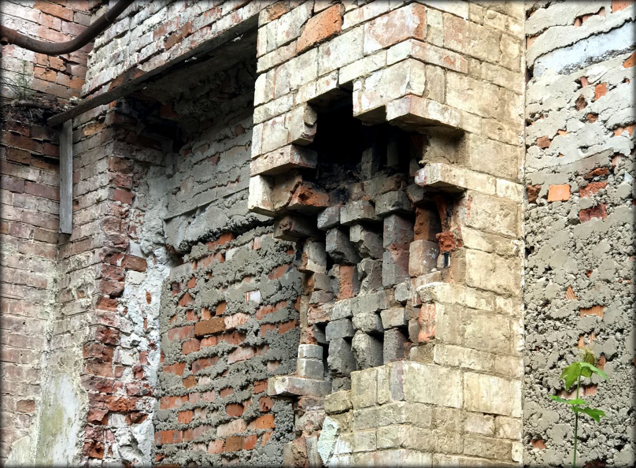 Нужную дверцу в заборе я всё же нашёл и смог полазить по руинам былого величия. Сейчас там всё находится в печальном состоянии — нет потолка, многих стен и даже отсутствует пол. Виной этому не только время, но к сожалению и сами люди.