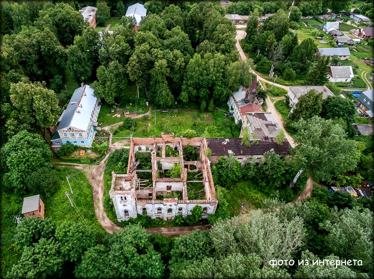 Нашёл снимок сверху. Печальная картина. Слева виден двухэтажный барак. Раньше это был западный усадебный флигель, который предназначался для прислуги, а в советское время здесь размещался музей и кабинеты научных сотрудников.
