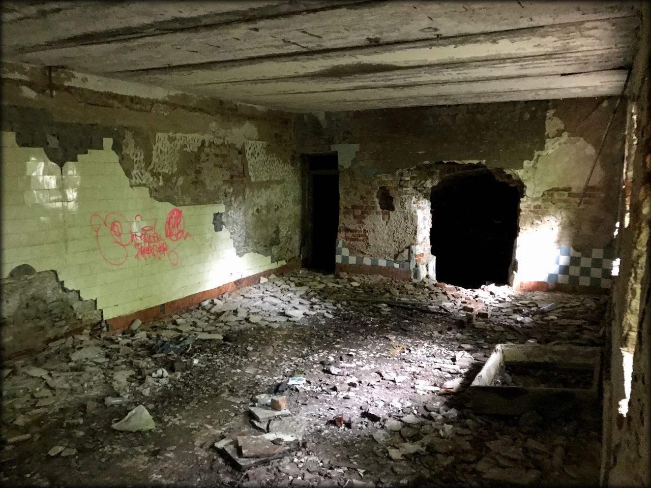 Заглянул в одно из подвальных помещений. Видно, что плитка осталась с советских времён. Возможно это была столовая.