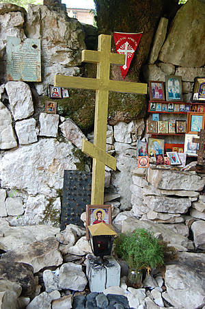 Вид у могилы конечно не очень представителен, полуразваленное строение над могилой, но зато с железными воротами.Паломники пишут записки и кладут их под камни над могилой святого, т.к. считается ,что святой помогает людям исцеляться от недугов .