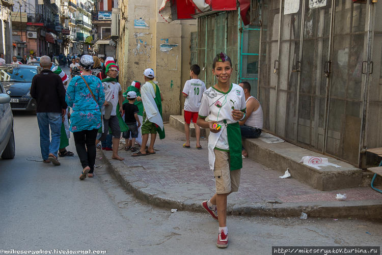 Матч финальной части ЧМ-2014 в Бразилии между Алжиром и Бельгией начинался в 17:00 по алжирскому времени и чем ближе было это событие, тем больше «движухи» было на улицах. Почти все мальчики и мужчины одевались в бело-зелёные футболки и кепки и дудели в дудки.