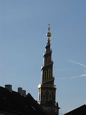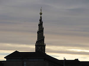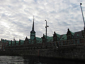 Здание биржи. Примечателен шпиль, который образован сплетёнными хвостами драконов. По легенде эти драконы охраняют биржу.