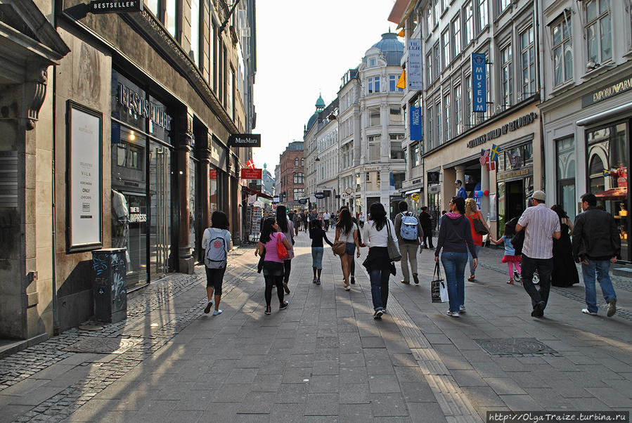 Название улицы переводится как "прогуливаться", она считается самой длинной и старой пешеходной улицей в Европе. Вообще, это даже не одна улица, а целых три, которые дополняют друг друга, и образуют тот самый променад — Strøget. Общая протяженность улиц 1,5 км. Тут сосредоточено огромное количество кафе, ресторанов, магазинов и ночных клубов.