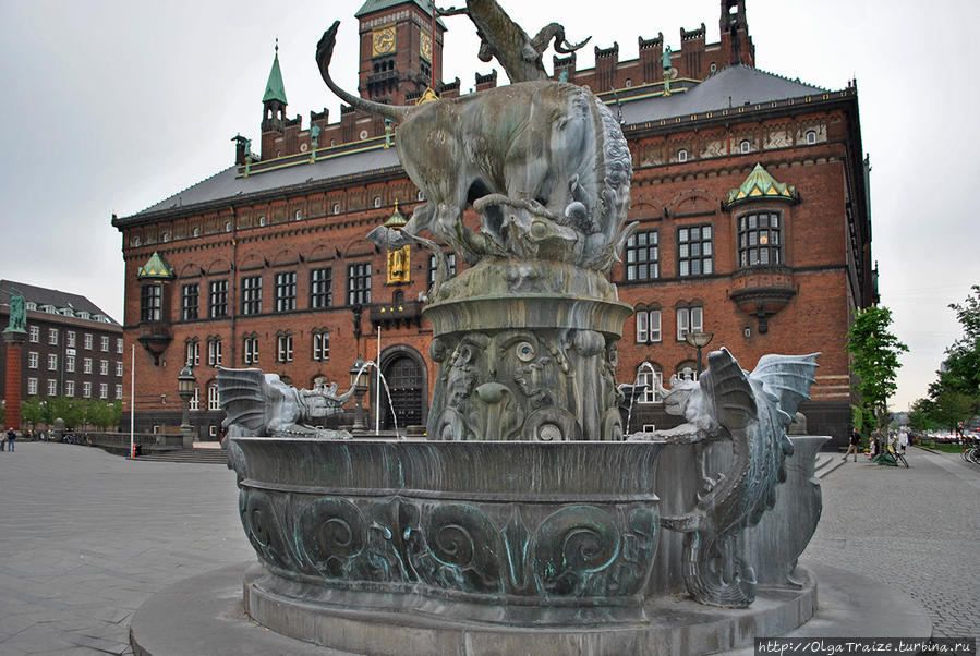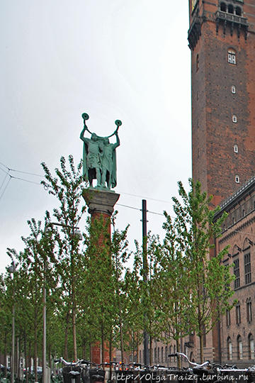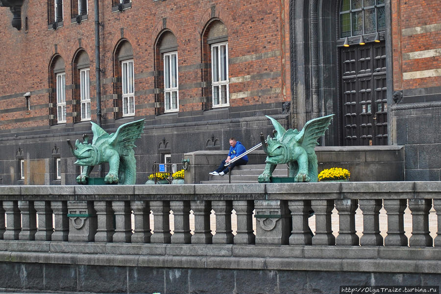 Около Ратуши сидят скульптуры драконов, их очень много в датской столице, так как дракон любимый персонаж датчан.
