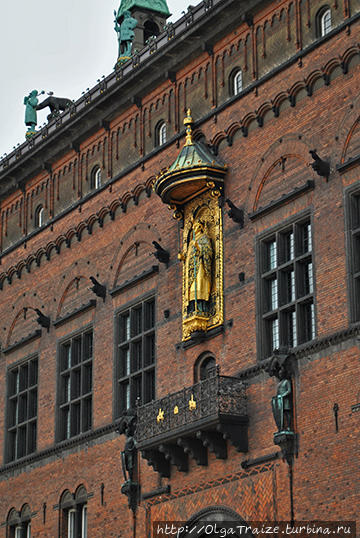 Если преодолеть 300 ступеней, Вы окажитесь на вершине башни. На фасаде Ратуши можно полюбоваться позолоченной скульптурой епископа Абсалона — отца Копенгагена, того самого епископа, который построил дворец Christiansborg (о дворце Christiansborg говорилось в предыдущей записи