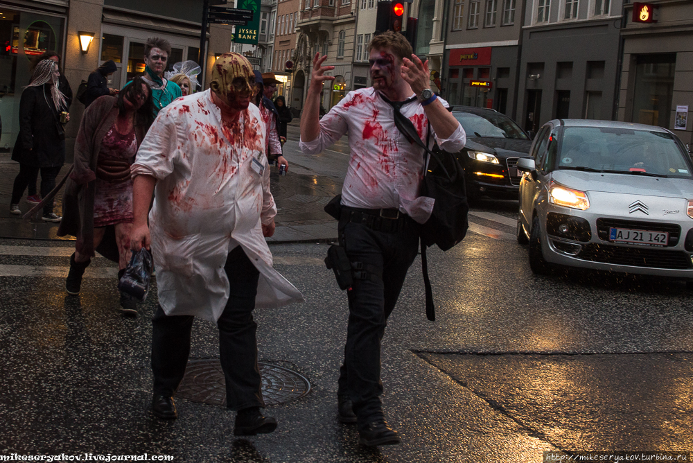 Я попал на ежегодный парад именуемый zombie crawl или "ползущие зомби". Раз в год молодежь Копенгагена и близлежащих пригородов в ночь перед национальным праздником Вознесения Христа устраивает тусовочную вечеринку, где все участники одеваются и гримируют себя как зомби. Зомби — это мёртвые люди, восставшие из потустороннего мира, пришедшие к нам поквитаться за всё.
