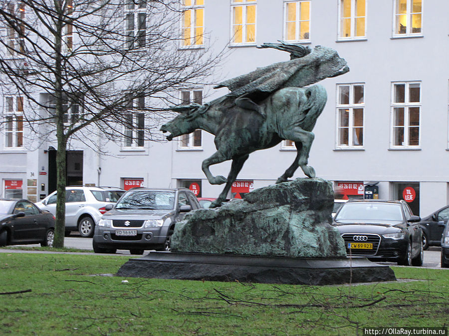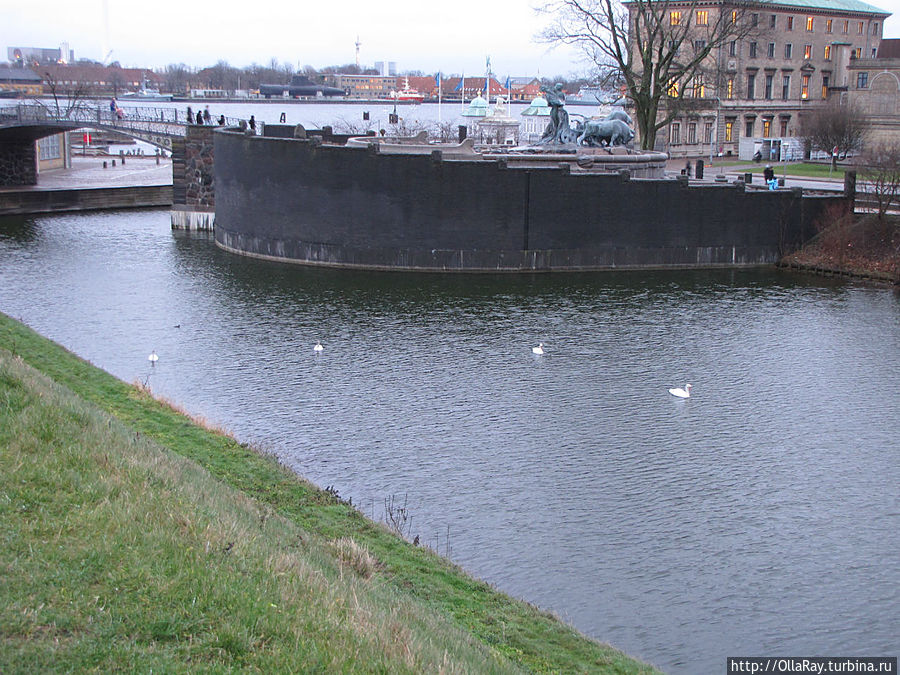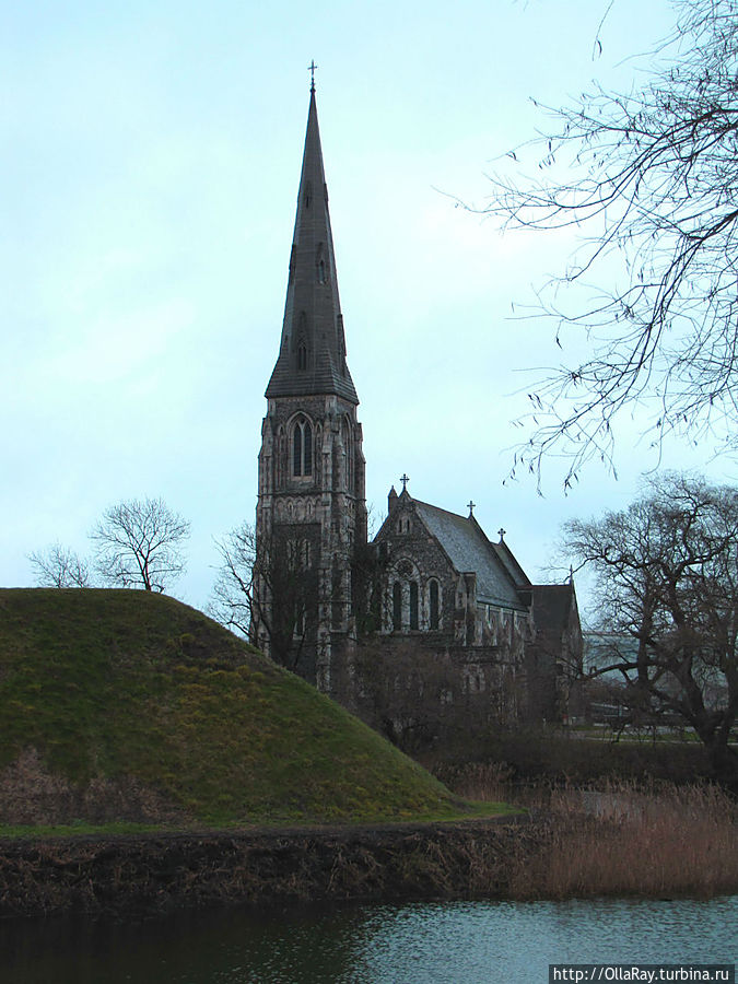 Отсюда рукой подать до англиканской церкви святого Албана (не путать с доктором:) ). Мимо неё, в общем, не пройдёте. Красивая, но несколько мрачноватая. Здесь некоторое время покоились останки датского короля Кнуда и его брата, убитых в этой церкви восставшей знатью в 1086 году. С другой стороны от церкви расположен знаменитый фонтан "Гефион". На фото он виднеется слева. А в канале плавают лебеди, которых в Дании много.