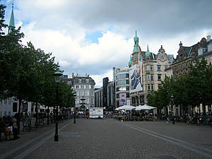Позади Ратушной площади начинается самая старая и самая длинная пешеходная зона в Европе — Строгет. Она состоит из нескольких улиц, которые перетекают одна другую. На этих улочках огромное количество баров, кафе, сувенирных магазинчиков. По пути туристов встречают и развлекают уличные музыканты и "живые скульптуры".