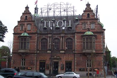 Вход в парк Тиволи находится рядом с Ратушей на Ратушной площади. Его центральное здание дополняет краснокирпичный ансамбль площади. Так как посещение этого парка развлечений предполагает наличие большого количества времени, он для нас, проведших в Копенгагене всего один день, оказался недоступен. Удалось лишь краем глаза его увидеть и отметить для себя необходимость его посещения в следующий раз...