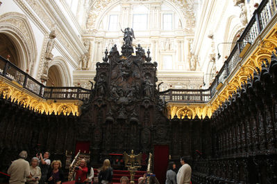 Отдельного слова заслуживает сам собор, построенный в 16 веке в самом центре мечети. Здесь заслуживают внимания хоры и сиденья из красного дерева со сценами жизни пресвятой Девы и Ретабло (алтарный образ), который изготовлен из кабрского мрамора в 1618 году. Изначальную живопись ретабло в церкви, где были изображены святые Кордовы, позже заменили на работы Паломино – автора огромного полотна со сценой Успения Богоматери, давшего название соборной мечети в 16 веке.
