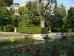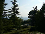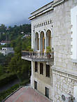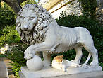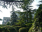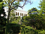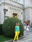В Крыму, в окрестностях Ялты, находятся три дворца российской аристократии: Ливадийский дворец в Ливадии, Воронцовский в Алупке и Юсуповский дворец в Кореизе. Все три дворца связаны с Ялтинской конференцией глав государств антигитлеровской коалиции, состоявшейся в Крыму в феврале 1945 г и определившей послевоенное устройство Европы, да, пожалуй, и мира. Сама конференция проводилась в Ливадийском дворце. Там же проживала делегация США во главе с президентом Ф.Рузвельтом. Президент США был инвалидом, передвигался в коляске, и ему трудно было выезжать куда-то из своих апартаментов. Воронцовский дворец в Алупке занимала делегация Великобритании во главе с премьер-министром У.Черчиллем. А вот советская делегация во главе с генералиссимусом И.Сталиным занимала Юсуповский дворец. В отличие от дворцов в Ливадии и в Алупке, превращенных в музеи, Юсуповский дворец находится в ведении Совета Безопасности Украины. Это одна из Госдач, которых в Крыму несколько. Попасть туда на экскурсию непросто. Это стало возможно лишь с 2002 года только в составе организованной экскурсионной группы и лишь тогда, когда на даче никто из украинской политической элиты не отдыхает. В сентябре 2012 г нам повезло, и мы на такую экскурсию попали. Начинается экскурсия перед дворцом Юсуповых, с его северного, обращенного к горам фасада. Перед дворцом растут три пальмы, посаженные в честь конференции антигитлеровской коалиции.