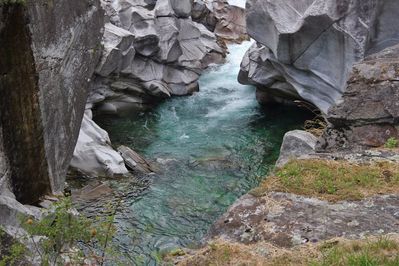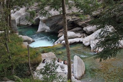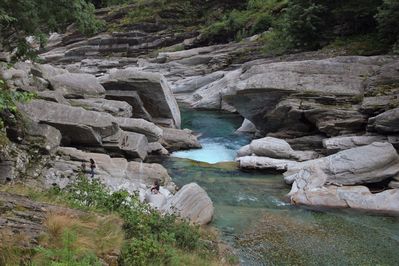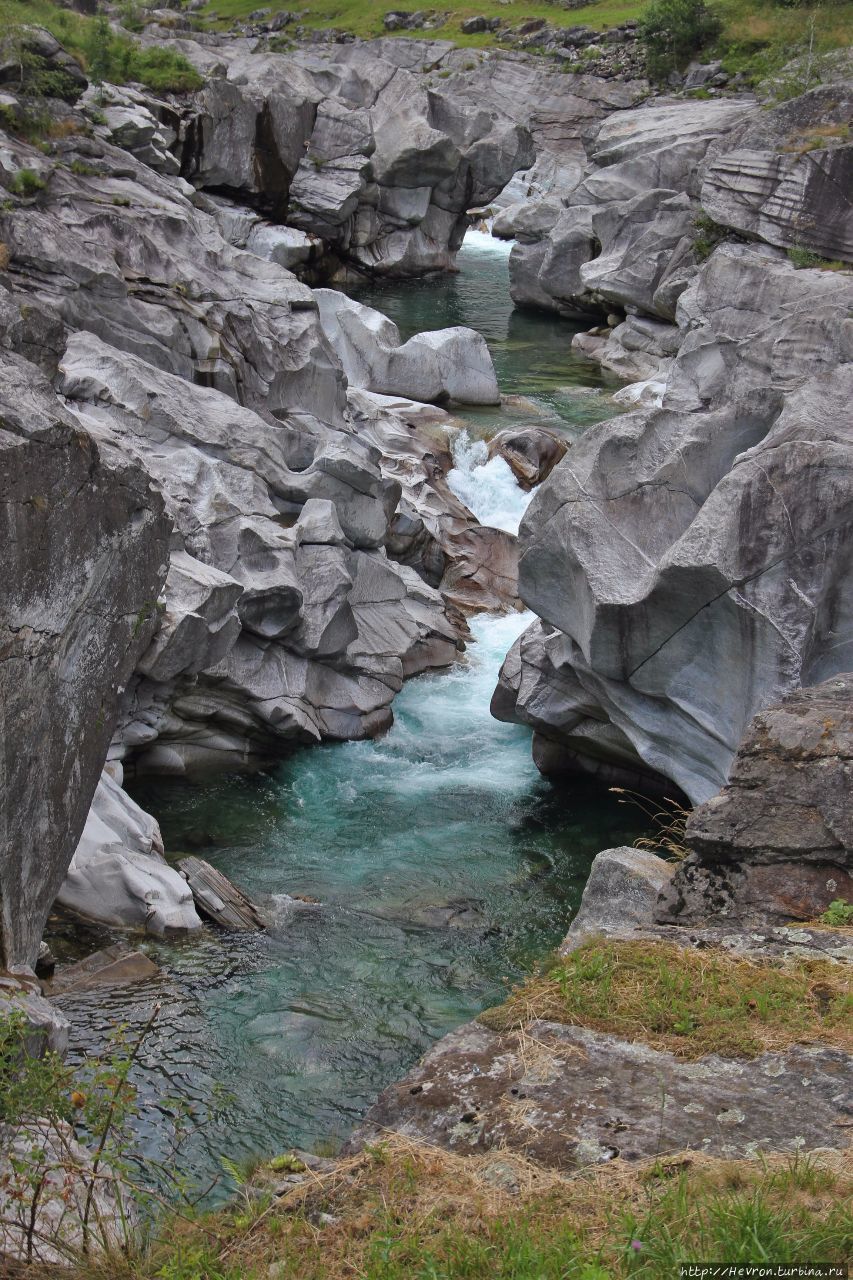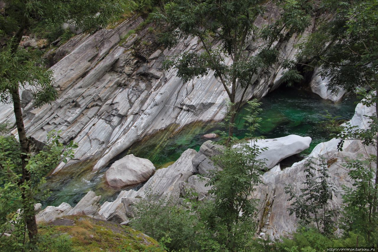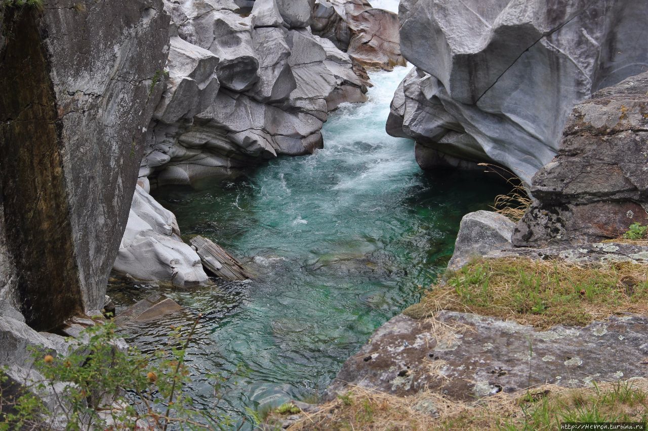 Одно из самых потрясающих мест кантона Тичино и, пожалуй, всей Швейцарии — долина реки Верзаска. Воды этой реки больше зеленые, чем бирюзовые или голубые, как по всей стране. Протяженность реки 30 км и протекает она сквозь каменистые образования. Хотя река узкая и не глубокая, она достаточно бурная. И своим темпераментом она высекла просто невероятные изгибы из каменной породы. Такого я еще не встречала!