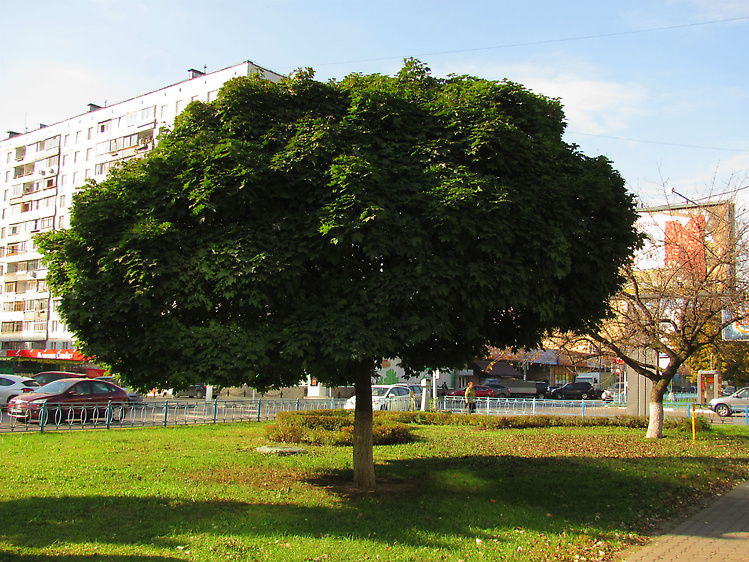 В центре проспекта растёт этот роскошный клён. Каждый год любуюсь его изумительно сформированной кроной. До самых морозов листва сохранит насыщенно-зелёную окраску и опадет на землю лишь слегка побурев. Рядом с клёном стоит уже сбросившая листья груша. Весной, во время цветения груши, эти два дерева образуют очень красивую пару.