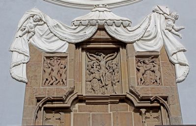 Тем более здесь есть пара, обращающих на себя внимание, фрагментов. Первый — над главным порталом в барочный навес встроен готический барельеф на темой Великой Голгофы, оригинал, сохранившийся с 14-го века.