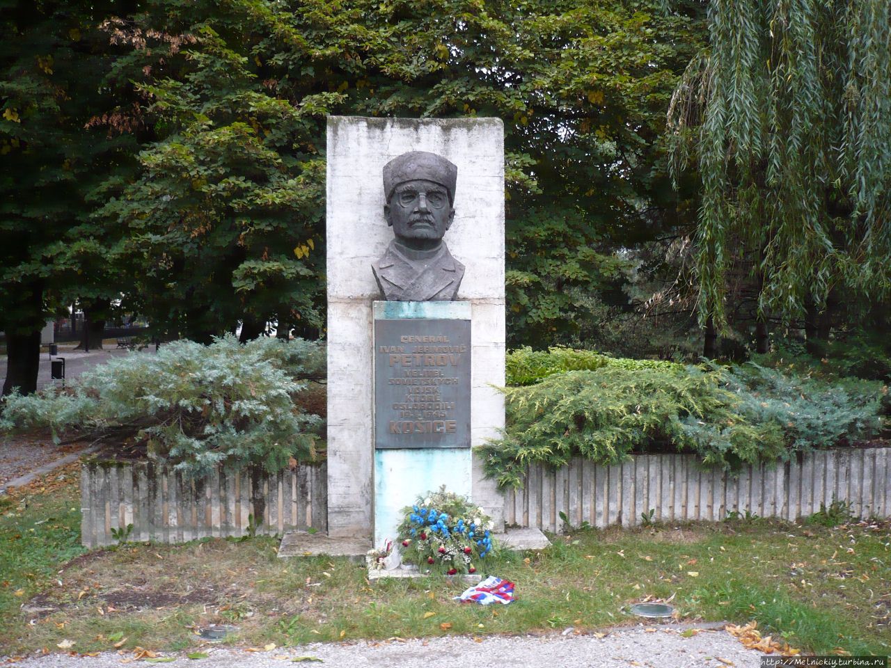 Прогуливаясь возле Городского парка, заметил бюст какому-то деятелю. Подошел поближе и увидел скульптурное изображение генерала армии Советского Союза Ивана Ефимовича Петрова. На постаменте надпись на словацком языке «Генерал Иван Ефимович Петров командующий советскими войсками, которые освободили Кошице 19.01.1945 года».