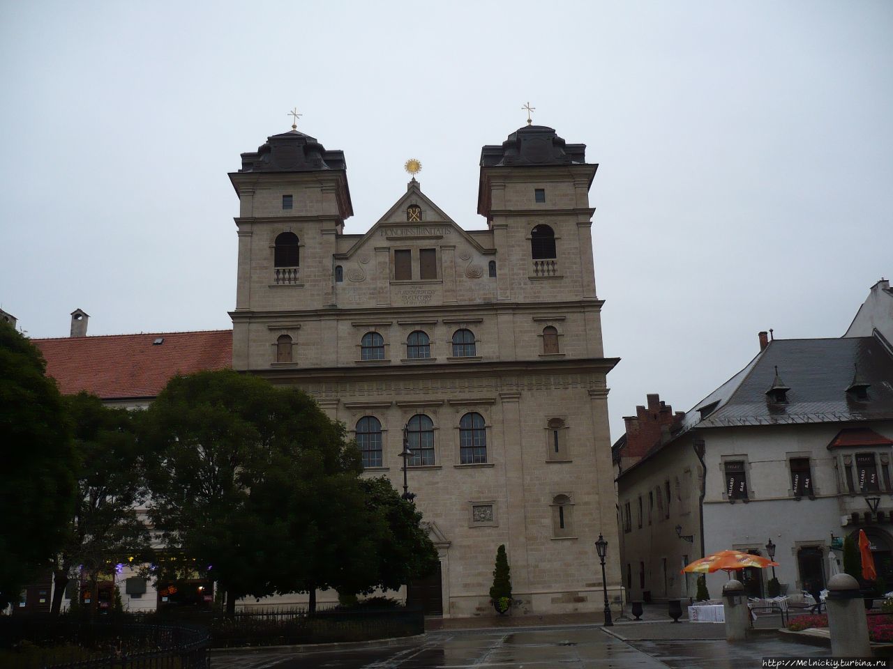 То место на Главной улице, где стоит Чумная колонна, образует своеобразную площадь. Здесь стоит Премонстрантская церковь во имя Святой Троицы. Премонстранты – это «Орден регулярных каноников-премонстрантов», основанный в 1120 году святым Норбертом. Раньше на этом месте стояла иезуитская часовня. В ночь с 6 на 7 сентября 1619 года иезуиты были подвергнуты мучительным пыткам, а позже убиты солдатами Дьёрдя I Ракоци. От зверского убийства монахов был шокирован весь город. Невесткой Ракоци Жофией Батори был выкуплен участок земли для возведения иезуитской церкви, прообразом которой была римская иезуитская церковь Иль-Джезу. Строительство церкви завершили в 1681 году, а в 1811 году её передали премонстрантам.
