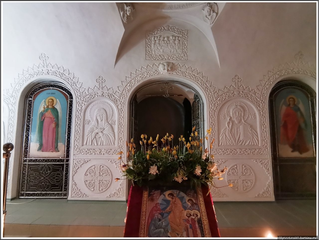 Внутри храм украшен фресками и изумительной по своей красоте и тонкости исполнения резьбой, выполненной белгородскими художниками.