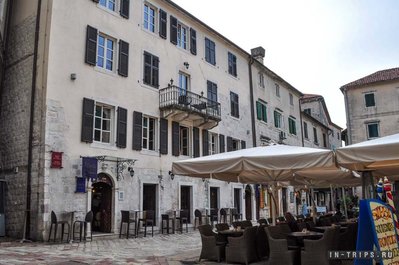 Напротив бывший Наполеоновский театр, построенный французами в 1810. Это 1-ый и старейший театр Черногории, теперь здесь 4*отель (вдали слева).